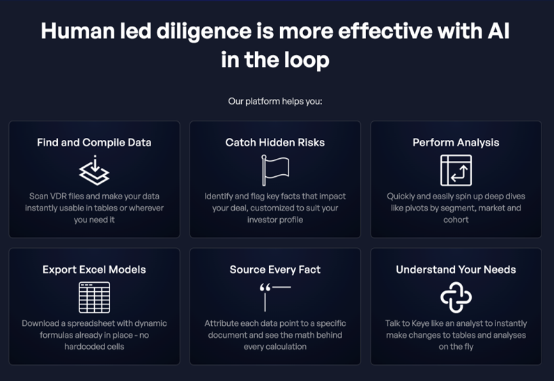 Keye는 private equity 투자자를 위한 AI 기반 실사 플랫폼으로, 복잡한 원본 데이터를 수일이 아닌 수분 만에 활용 가능한 인사이트로 전환합니다. Keye를 사용하는 고객사들은 딜당 평균 5일 이상의 실사 시간을 단축하고, 월 100만 건 이상의 분석 결과를 생성하며 실사 효율성과 투자 판단력을 높이고 있습니다.